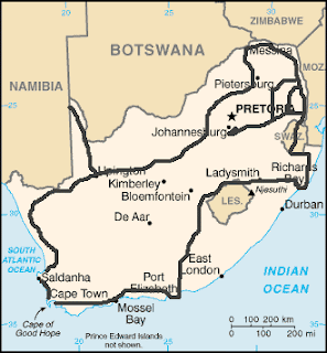 Upon arrival we immediately left Johannesburg behind us in our Almire Nissan rented for $28 a day, insurance included. We went to Witbank, a small town en route to Kruger Park. (route travelled in SA about 12000km in 52 days >>>>